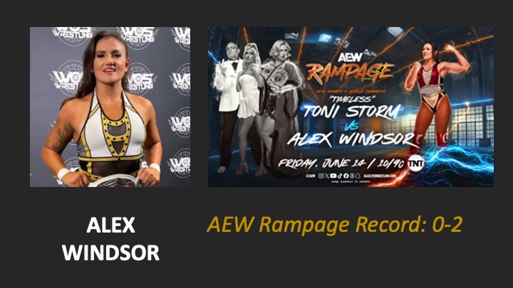 | AEW Rampage #149 – Airdate: 2024 June 14. Location: Wells Fargo Arena in Des Moines, Iowa, USA. | Toni Storm (w/Luther & Mariah May) defeats Alex Windsor (8:01) |