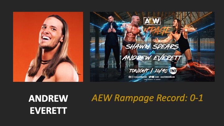 | AEW Rampage #23 – Airdate: 2022 January 14. Location: PNC Arena in Raleigh, North Carolina, USA. | Shawn Spears (w/Wardlow) defeats Andrew Everett (0:57) |