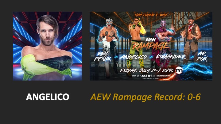 | AEW Rampage #153 – Airdate: 2024 July 12. Location: Landers Center in Southaven, Mississippi, USA. | Four Way Match: Rey Fenix defeats Angelico and AR Fox and Komander (10:21) |
