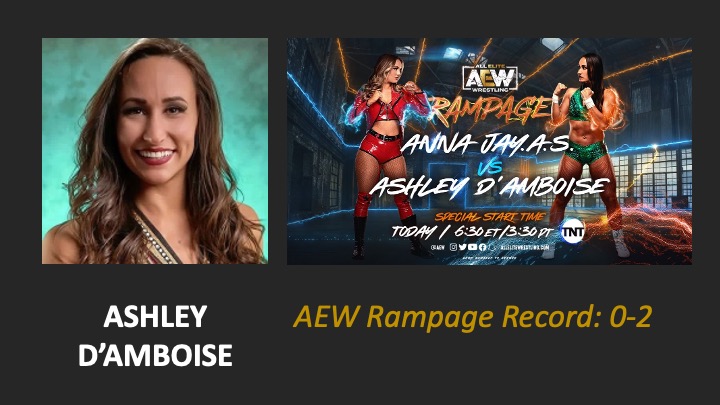 | AEW Rampage #90 – Airdate: 2023 April 28. Location: FLA Live Arena in Sunrise, Florida, USA. | Anna Jay AS defeats Ashley D’Amboise (5:43) |