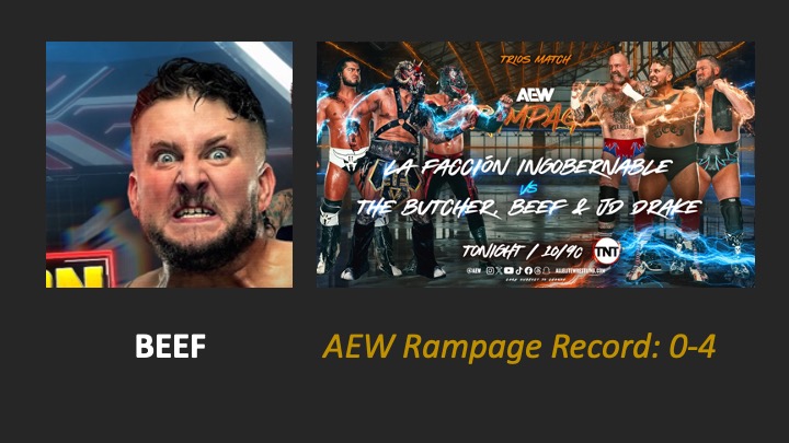 | AEW Rampage #169 – Airdate: 2024 November 1. Location: Wolstein Center in Cleveland, Ohio, USA. | La Faccion Ingobernable (Dralistico, Rush & The Beast Mortos) defeat BEEF, JD Drake & The Butcher (9:23) |