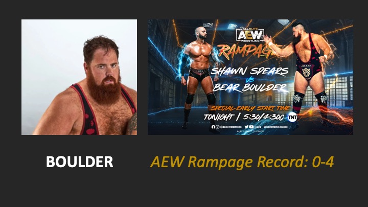 | AEW Rampage #40 – Airdate: 2022 May 13. Location: UBS Arena in Elmont, New York, USA. | Shawn Spears defeats Bear Boulder (2:03) |