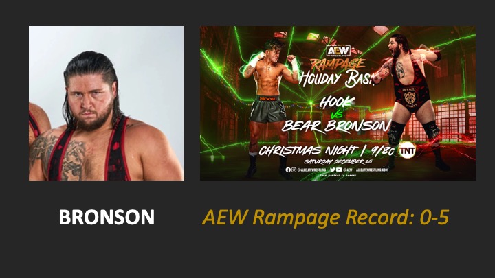 | AEW Rampage #20: Holiday Bash 2021, Night 2 – Airdate: 2021 December 25. Location: Greensboro Coliseum in Greensboro, North Carolina, USA. | Hook defeats Bear Bronson (3:07) |