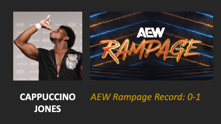 | AEW Rampage #133 – Airdate: 2024 February 23. Location: BOK Center in Tulsa, Oklahoma, USA. | The Young Bucks (Matthew Jackson & Nicholas Jackson) defeat Cappuccino Jones & Jonny Lyons (2:18) |