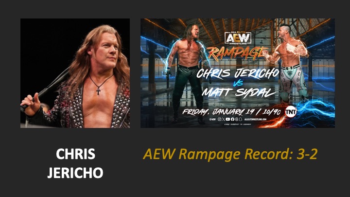 | AEW Rampage #128 – Airdate: 2024 January 19. Location: North Charleston Coliseum in North Charleston, South Carolina, USA. | Chris Jericho defeats Matt Sydal (10:37) |