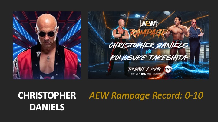 | AEW Rampage #129 – Airdate: 2024 January 26. Location: Enmarket Arena in Savannah, Georgia, USA. | Konosuke Takeshita (w/Kyle Fletcher & Powerhouse Hobbs) defeats Christopher Daniels (3:06) |