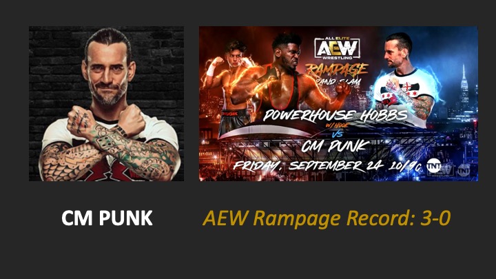 | AEW Rampage #7: Grand Slam 2021, Night 2 – Airdate: 2021 September 24. Location: Arthur Ashe Stadium in New York City, New York, USA. | CM Punk defeats Powerhouse Hobbs (w/Hook) (13:35) |