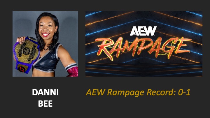 | AEW Rampage #93 – Airdate: 2023 May 19. Location: Moody Center in Austin, Texas, USA. | AEW TBS Title Match: Jade Cargill (w/Leila Grey & Mark Sterling) (c) defeats Danni Bee (0:36) |
