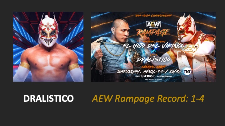 | AEW Rampage #89: Saturday Night Rampage – Airdate: 2023 April 22. Location: Petersen Events Center in Pittsburgh, Pennsylvania, USA. | AAA Mega Title Match: El Hijo del Vikingo (c) defeats Dralistico (w/Jose The Assistant, Preston Vance & Rush) (11:33) WON * * * * |