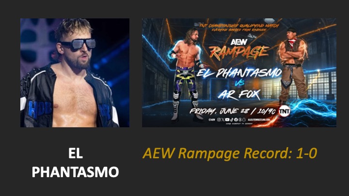 | AEW Rampage #151 – Airdate: 2024 June 28. Location: PPL Center in Allentown, Pennsylvania, USA. | AEW TNT Title Forbidden Door Qualifying Match: El Phantasmo defeats AR Fox (5:25) |