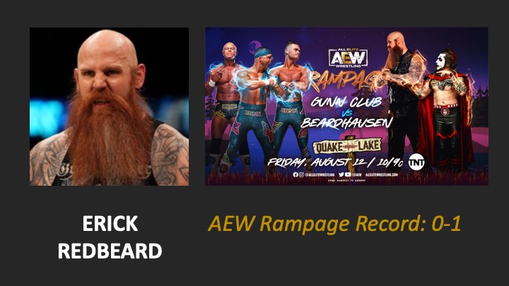 | AEW Rampage #53: Quake by the Lake, Night 2 – Airdate: 2022 August 12. Location: Target Center in Minneapolis, Minnesota, USA. | The Gunn Club (Austin Gunn & Colten Gunn) (w/Billy Gunn) defeat Beardhausen (Danhausen & Erick Redbeard) (6:05) |