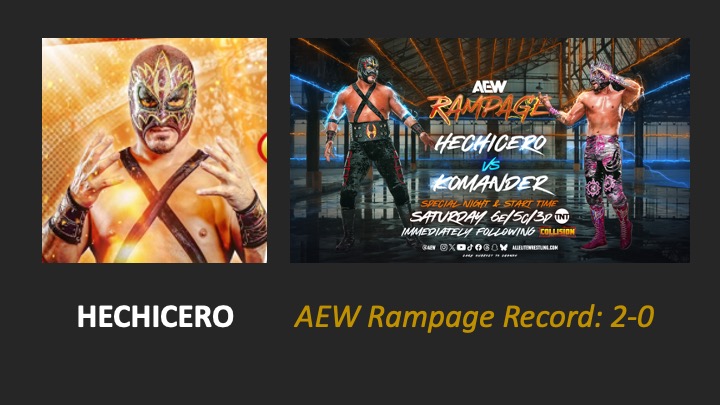 | AEW Rampage #173 – Airdate: 2024 November 30. Location: Santander Arena in Reading, Pennsylvania, USA. | Hechicero defeats Komander (w/Alex Abrahantes) (13:04) WON * * * * |