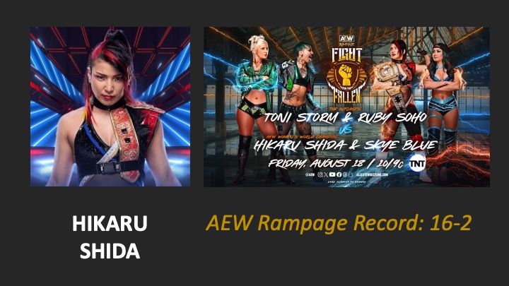 | AEW Rampage #106: Fight for the Fallen 2023, Night 2 – Airdate: 2023 August 18. Location: Bridgestone Arena in Nashville, Tennessee, USA. | Hikaru Shida & Skye Blue defeat The Outcasts (Ruby Soho & Toni Storm) (w/Saraya) (10:08) |
