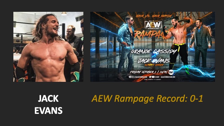 | AEW Rampage #8 – Airdate: 2021 October 1. Location: Blue Cross Arena in Rochester, New York, USA. | Hair Vs. Hair Match: Orange Cassidy defeats Jack Evans (w/Matt Hardy) (9:04) |