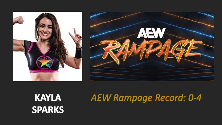| AEW Rampage #29 – Airdate: 2022 February 25. Location: Webster Bank Arena in Bridgeport, Connecticut, USA. | The Professor’s Five Minute Rookie Challenge Match: Serena Deeb defeats Kayla Sparks (2:29) |