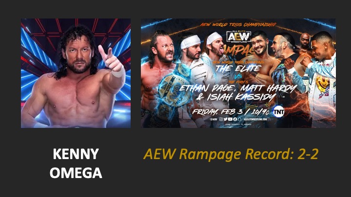 | AEW Rampage #78 – Airdate: 2023 February 3. Location: Nutter Center in Dayton, Ohio, USA. | AEW World Trios Title Match: The Elite (Kenny Omega, Matt Jackson & Nick Jackson) (w/Brandon Cutler & MT Nakazawa) (c) defeat The Firm (Ethan Page, Isiah Kassidy & Matt Hardy) (w/Stokely Hathaway) (14:44) |