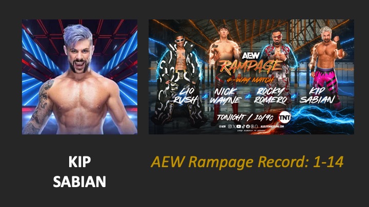 | AEW Rampage #163 – Airdate: 2024 September 20. Location: Mohegan Sun Arena in Wilkes-Barre, Pennsylvania, USA. | Four Way Match: Nick Wayne defeats Lio Rush (w/Action Andretti) and Kip Sabian and Rocky Romero (10:47) |