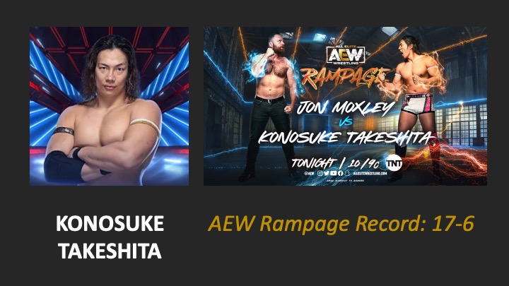 | AEW Rampage #116 – Airdate: 2023 October 27. Location: Liacouras Center in Philadelphia, Pennsylvania, USA. | Konosuke Takeshita defeats Kyle Fletcher (11:17) WON * * * * |