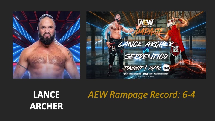 | AEW Rampage #37 – Airdate: 2022 April 22. Location: Petersen Events Center in Pittsburgh, Pennsylvania, USA. | Lance Archer (w/Jake Roberts) defeats Serpentico (0:33) |