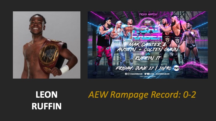 | AEW Rampage #45: Road Rager 2022, Night 2 – Airdate: 2022 June 17. Location: Chaifetz Arena in St. Louis, Missouri, USA. | Max Caster & The Gunn Club (Austin Gunn & Colten Gunn) (w/Anthony Bowens & Billy Gunn) defeat Ruffin It (Bear Boulder, Bear Bronson & Leon Ruffin) (1:15) |