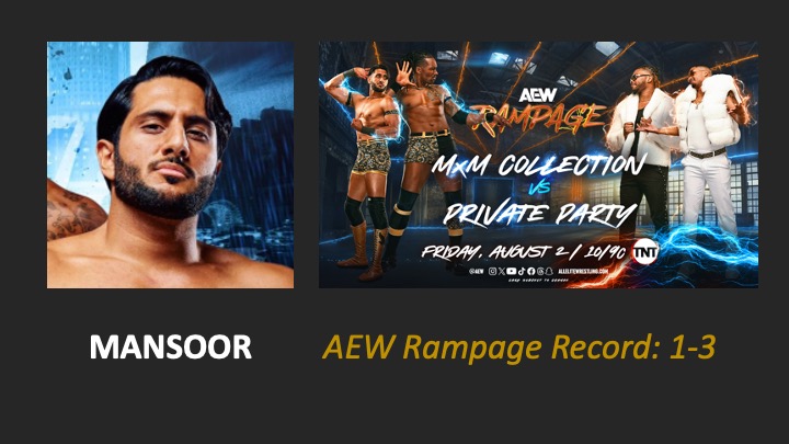 | AEW Rampage #156 – Airdate: 2024 August 2. Location: Bon Secours Wellness Arena in Greenville, South Carolina, USA. | MxM Collection (Mansoor & Mason Madden) defeat Private Party (Isiah Kassidy & Marq Quen) (12:04) |