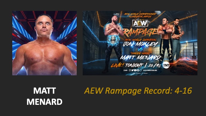 | AEW Rampage #64 – Airdate: 2022 October 28. Location: Mohegan Sun Arena in Uncasville, Connecticut, USA. | AEW World Title Eliminator Match: Jon Moxley [c] defeats Matt Menard (w/Angelo Parker) (8:05) |