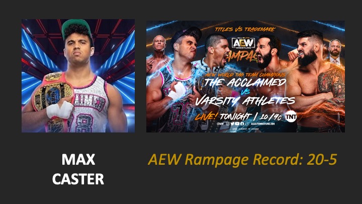 | AEW Rampage #63 – Airdate: 2022 October 21. Location: Daily’s Place in Jacksonville, Florida, USA. | AEW World Tag Team Title Vs. Trademark Match: The Acclaimed (Anthony Bowens & Max Caster) (w/Billy Gunn) (c) defeat The Varsity Athletes (Josh Woods & Tony Nese) (w/Mark Sterling) (8:06) |