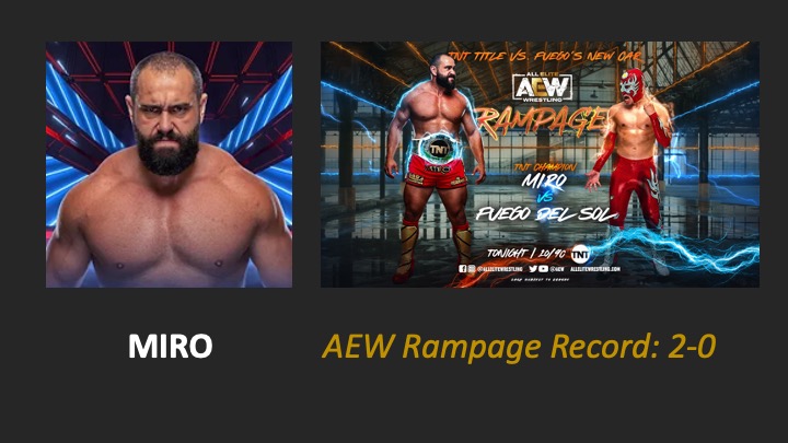 | AEW Rampage #1 – Airdate: 2021 August 13. Location: Petersen Events Center in Pittsburgh, Pennsylvania, USA. | AEW TNT Title Match: Miro (c) defeats Fuego Del Sol (1:59) |