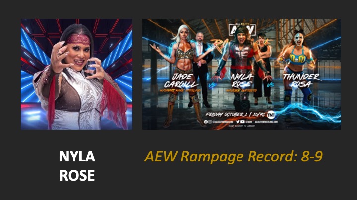 | AEW Rampage #62 – Airdate: 2022 October 14. Location: Coca-Cola Coliseum in Toronto, Ontario, Canada. | Nyla Rose (w/Marina Shafir & Vickie Guerrero) defeats Anna Jay AS (w/Angelo Parker & Matt Menard) (5:34) |