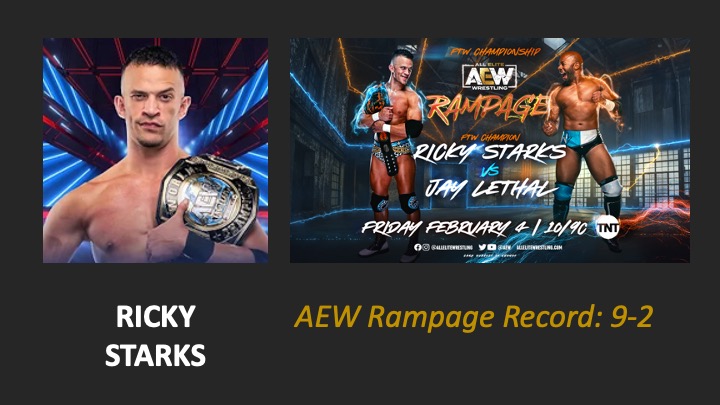 | AEW Rampage #26 – Airdate: 2022 February 4. Location: Wintrust Arena in Chicago, Illinois, USA. | FTW Title Match: Ricky Starks (w/Powerhouse Hobbs) (c) defeats Jay Lethal (12:51) |