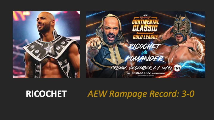 | AEW Rampage #174 – Airdate: 2024 December 6. Location: Fishers Event Center in Fishers, Indiana, USA. | Continental Classic 2024 Gold League Match: Ricochet [3] defeats Komander [0] (12:28) WON * * * * ½ |