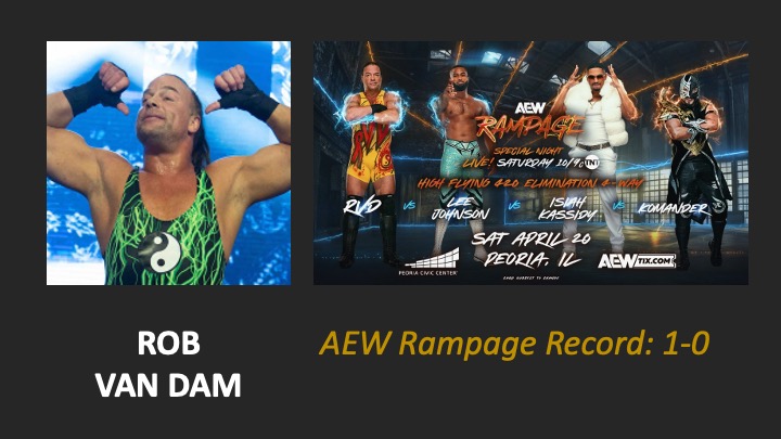 | AEW Rampage #141 – Airdate: 2024 April 20. Location: Peoria Civic Center in Peoria, Illinois, USA. | High Flying 4/20 Elimination Four Way Match: Rob Van Dam defeats Isiah Kassidy (w/Marq Quen) and Komander (w/Alex Abrahantes) and Lee Johnson (12:31) WON * * * ½ |