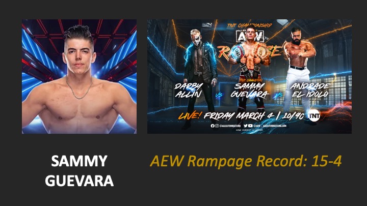 | AEW Rampage #30 – Airdate: 2022 March 4. Location: Addition Financial Arena in Orlando, Florida, USA. | AEW TNT Title Three Way Match: Sammy Guevara (c) defeats Andrade El Idolo and Darby Allin (13:12) WON * * * * ¼ |
