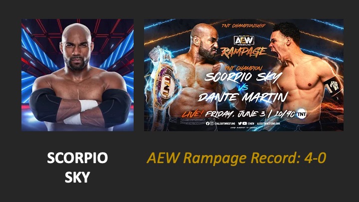 | AEW Rampage #43 – Airdate: 2022 June 3. Location: Toyota Arena in Ontario, California, USA. | AEW TNT Title Match: Scorpio Sky (w/Dan Lambert & Ethan Page) (c) defeats Dante Martin (w/Matt Sydal) (8:10) |
