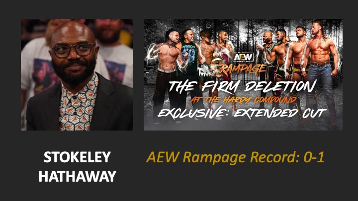 | AEW Rampage #91 – Airdate: 2023 May 5. Location: CFG Bank Arena in Baltimore, Maryland, USA. | The Firm Deletion Match: The Hardys (Jeff Hardy & Matt Hardy), Hook & Isiah Kassidy defeat The Firm (Big Bill, Ethan Page, Lee Moriarty & Stokely Hathaway) (13:38) |