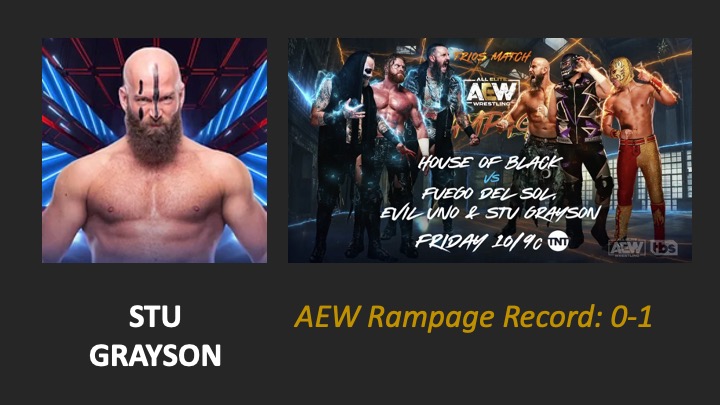 | AEW Rampage #34 – Airdate: 2022 April 1. Location: Colonial Life Arena in Columbia, South Carolina, USA. | House Of Black (Brody King, Buddy Matthews & Malakai Black) defeat Fuego Del Sol & The Dark Order (Evil Uno & Stu Grayson) (7:15) |