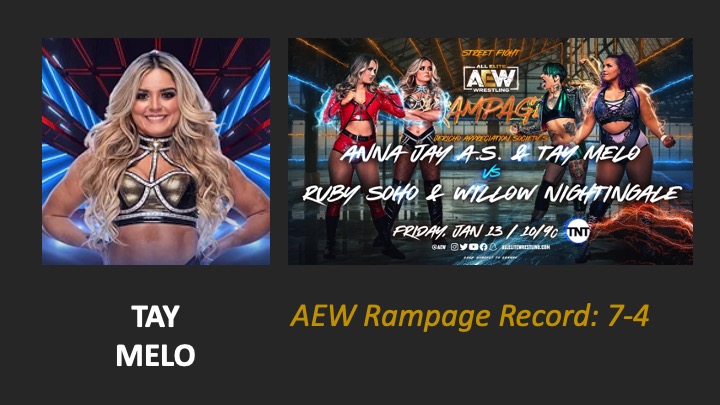 | AEW Rampage #75 – Airdate: 2023 January 13. Location: The Kia Forum in Inglewood, California, USA. | Tag Team Street Fight: Ruby Soho & Willow Nightingale defeat TayJay AS (Anna Jay AS & Tay Melo) (12:35) |