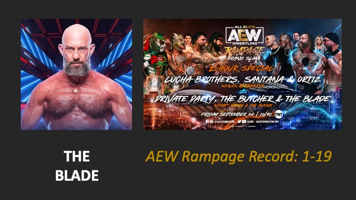 | AEW Rampage #99 – Airdate: 2023 June 30. Location: FirstOntario Centre in Windsor, Ontario, Canada. | Shawn Spears defeats The Blade (w/The Butcher) (4:00) |