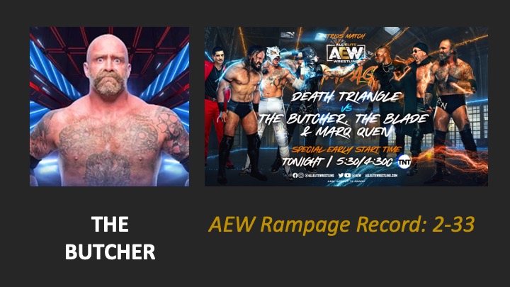 | AEW Rampage #36 – Airdate: 2022 April 15. Location: Curtis Culwell Center in Garland, Texas, USA. | The Butcher defeats Barrett Brown (0:55) |