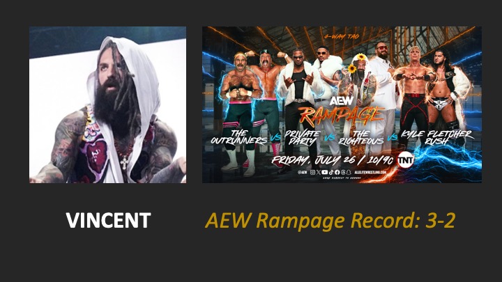 AEW Rampage #155: Royal Rampage 2024 – Airdate: 2024 July 26. Location: Bridgestone Arena in Nashville, Tennessee, USA.Four Way Tag Team Match: The Don Callis Family (Kyle Fletcher & Rush) defeat Private Party (Isiah Kassidy & Marq Quen) and The Outrunners (Truth Magnum & Turbo Floyd) and The Righteous (Dutch & Vincent) (8:51)
