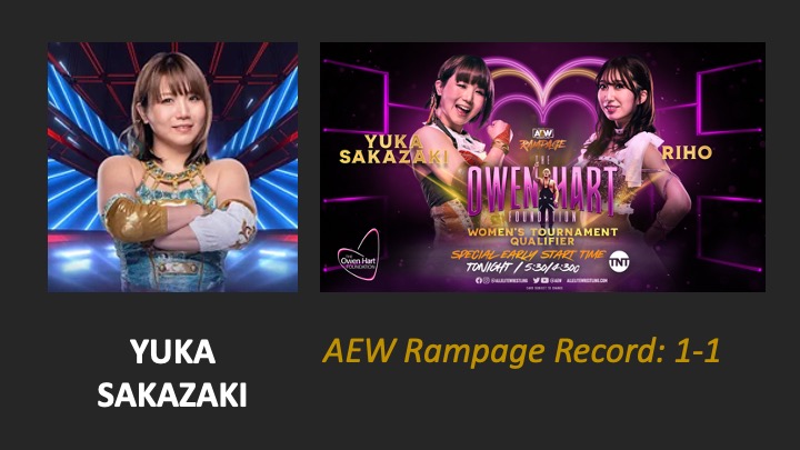 | AEW Rampage #39 – Airdate: 2022 May 6. Location: Chesapeake Employers Insurance Area in Baltimore, Maryland, USA. | Owen Hart Foundation 2022 Women’s Tournament Qualifying Match: Riho defeats Yuka Sakazaki (9:18) WON * * * ½ |