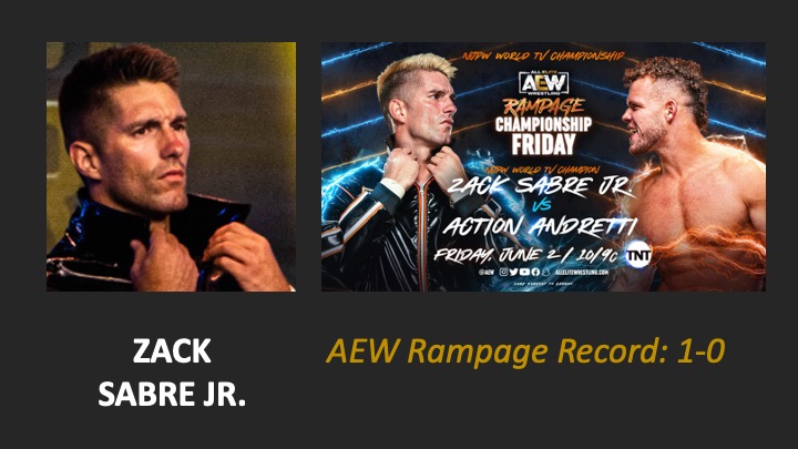 | AEW Rampage #95: Championship Friday – Airdate: 2023 June 2. Location: Viejas Arena in San Diego, California, USA. | NJPW World Television Title Match: Zack Sabre Jr. (c) defeats Action Andretti (10:15) WON * * * * |